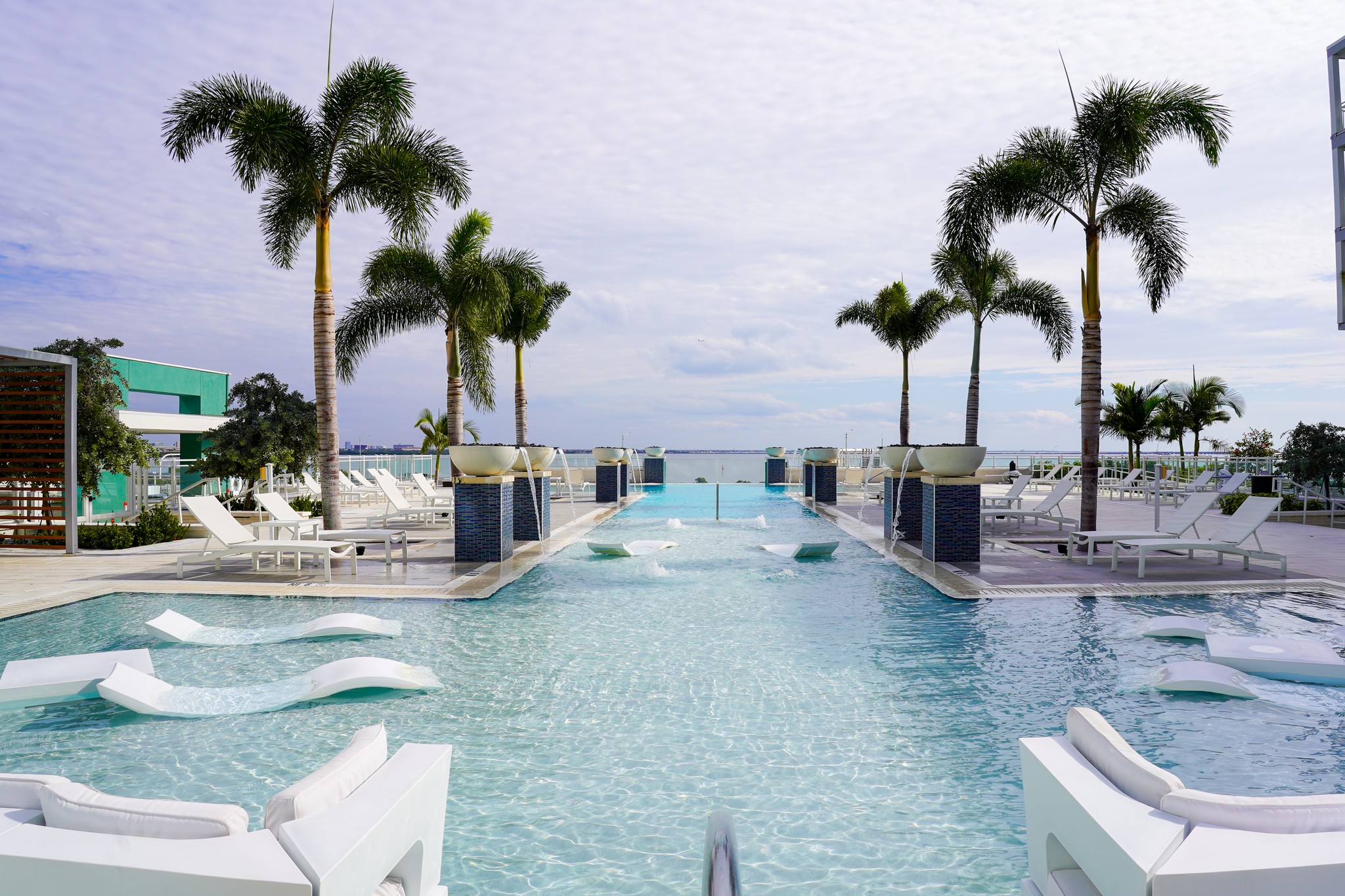 Resort-style pool with cabanas and an acrylic edge overlooking the bay